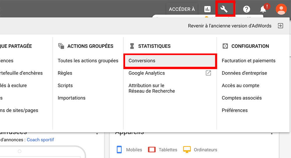 Afin de savoir si votre campagne est rentable ou non vous avez besoin d’indicateurs. Google Ads vous permet de créer des « conversions » (voir capture ci-dessous), ce qui vous permettra par exemple d’indiquer que votre page contact/demande de devis est un objectif de conversion ou un appel téléphonique. Vous pourrez ensuite voir quels mots-clés ont obtenu les meilleurs conversions et ajuster votre campagne avec ces informations.