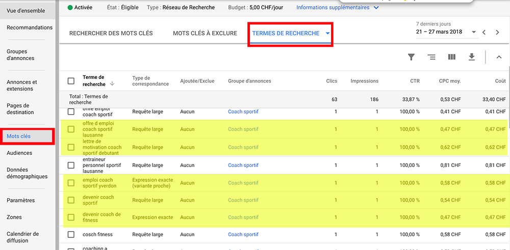 Dans l’exemple ci-dessous on a une campagne de promotion pour un « coach sportif à domicile« , on a identifié et surligné en jaune des expressions qui ne sont clairement pas liées avec la prestation que l’on propose (ex: lettre motivation coach sportif ou emploi coach sportif).