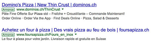 ​Ci-dessous on peut voir les annonces qui apparaissent sur l’expression « pizza maison ». On constate que l’on a un livreur de pizzas à domicile et un site qui vend des fours à pizza.