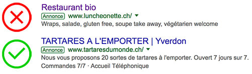La première annonce ne répond qu’à une seule des 3 réponses identifiées comme essentielles à savoir le type de nourriture. Il y a donc un fort risque que des visiteurs cliquent « juste » pour savoir l’emplacement du restaurant ou si le restaurant est ouvert le jour souhaité. C’est donc de l’argent dépensé dans des visites qui ne seront pas forcément qualifiées.