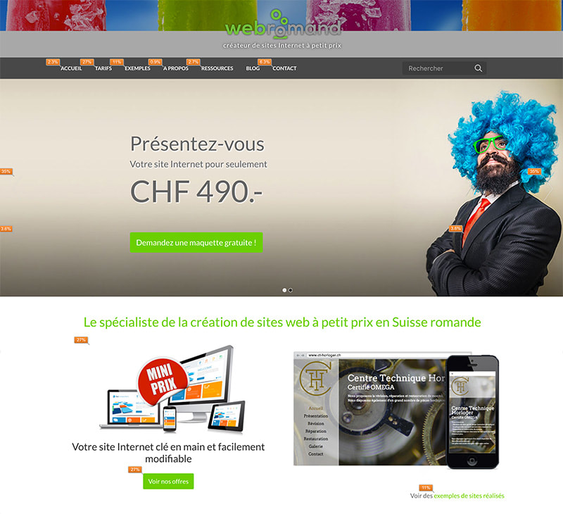 L’image ci-dessous indique le taux de clics sur les différents liens de notre page d’accueil. Notre volonté de départ était de proposer rapidement l’action permettant d’obtenir une maquette gratuite car nous menons des actions de vente hors site (ex: flyers) et nous souhaitions retrouver rapidement cette action sur notre page d’accueil. Pourtant les statistiques nous montrent que très peu de visiteurs utilisent cette action (env. 3,6%), en analysant les données nous constatons que la première action souhaitée par les visiteurs (même ceux qui ont par exemple reçu un flyer) et de voir le détail de notre offre. Nous avons donc changé l’action principale de notre page d’accueil et revu l’ensemble des actions sur les pages suivantes.